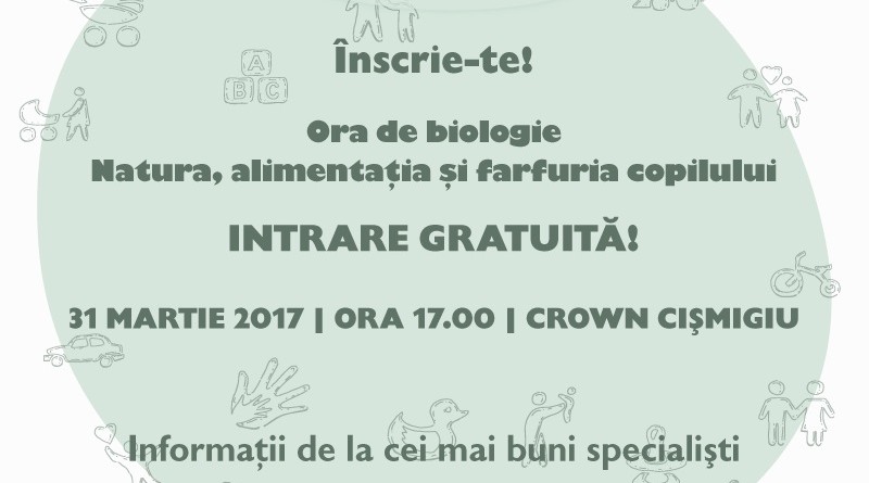 „Natura, alimentaţia şi farfuria copilului” este denumirea seminarului, care are ca scop o incursiune detaliată, plină de informaţii utile, în alimentaţia sănătoasă a copiilor. Seminarul se va se va desfășura între orele 17:00-20:00, la Crown Cișmigiu şi va fi moderat de Tily Niculae, o mămică tare dedicată la rândul ei. Mai mulți specialiști vor vorbi despre alăptare, diversificare şi alimentaţie sănătoasă.