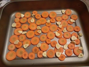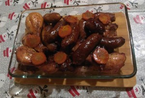 Totul este extrem de simplu. Tai morcovii rondele și usturoiul și le pun fundul unei tăvi cu strat antiaderent. Apoi pun carnea și deasupra ei cârnații, pentru că aceștia au și un pic de grăsime. Înțep dolofanii de cârnați cu o scobitoare, că prea nu-și mai încap în piele de lăudați ce sunt de tot familionul și, astfel, grăsimea din ei se duce la gătit și rămâne doar aroma minunată.