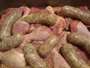 - vreo 6 cârnați de la bunica – din carne de vită și porc, bine condimentați (puteti folosi orice cârnați vă plac, daca nu aveți de casa). Musai pun și pui sau curcan, am o Mogâldeață mică și nu-mi surâde ideea să-i dau porc.