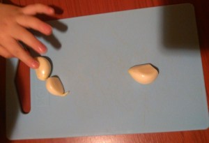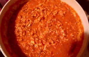 Toc usturoiul mărunt și îl înăbuș în ulei cu apă. O fi mai gustos călit, dar prefer să nu. Peste el adaug busuiocul și oregano (bineînțeles că sunt mai gustoase proaspete, dar sunt foarte bune și uscate). Apoi adaug carnea și roșiile. Mai pun cam 50-100 de ml de apă (se poate pune și vin) și le las la fiert.